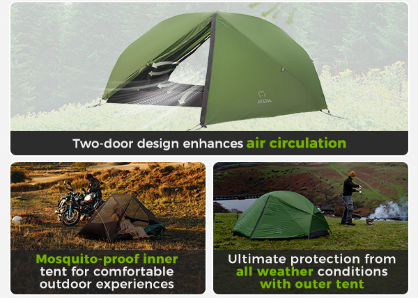 - Optimized Ventilation & Access: High‑density B3 mesh panels + dual top vents、double‑D doors with smooth two‑way zippers maximize airflow and easy access. Perfect for all season use, backpacking, bikepacking, hiking etc.