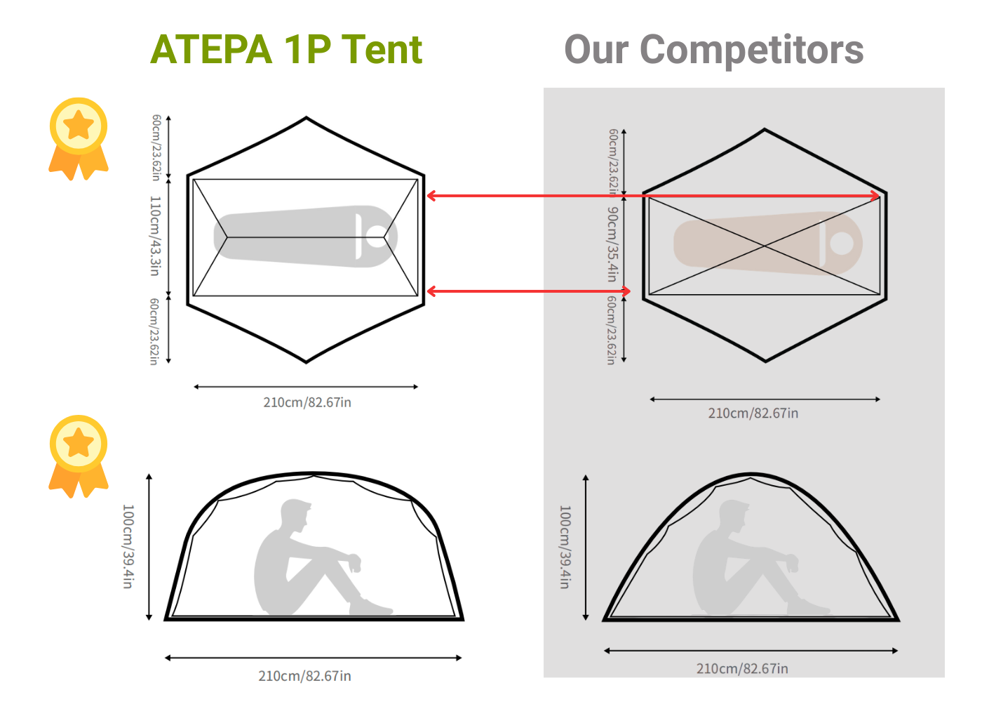 Camping freely, the tents offers bigger size of the groundsheet than general tents. With the top cross - beam design, it also features a remarkably large interior space(210 × 110 × 95cm or 82.7 × 43.3 × 37.4in) providing a more roomy experience, with ample space for sleeping and storing personal items