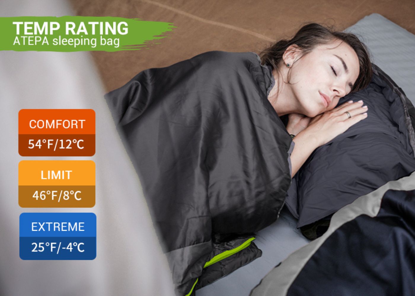 Temperature Ratings:With 650FP white duck down (90/10) filling, our sleeping bag provides reliable warmth. Rated for: Extreme Limit: 27℉ (-3℃);Lower Limit (Men): 45℉ (7℃);Comfort Limit (Women): 54℉ (12℃),Perfect for spring through early winter.