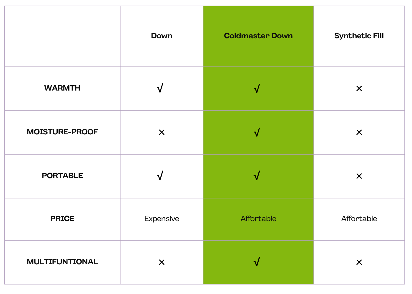 Compared nature down, Coldmaster down offers even warmth with no cold spots, (7% difference only) but perform better in wet environment (moisture-proof) with superior insulation.